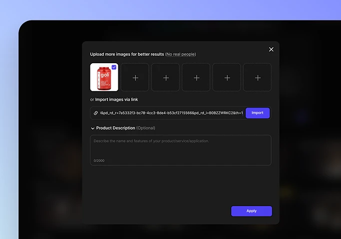 Paste a URL (Amazon, Shopify, etc.), upload images, or describe your product.