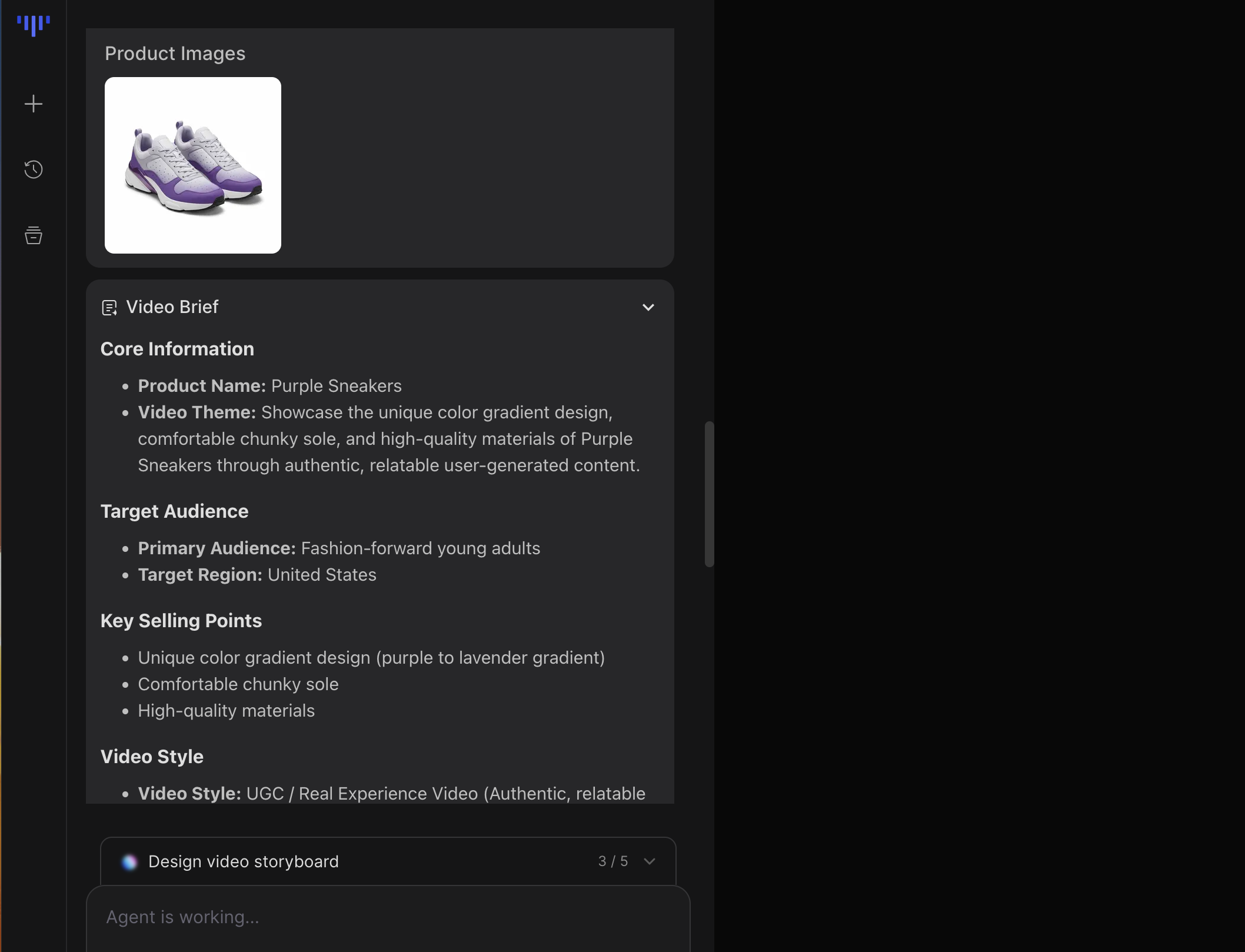 The Video Agent analyzes your input and automatically creates a full storyboard: