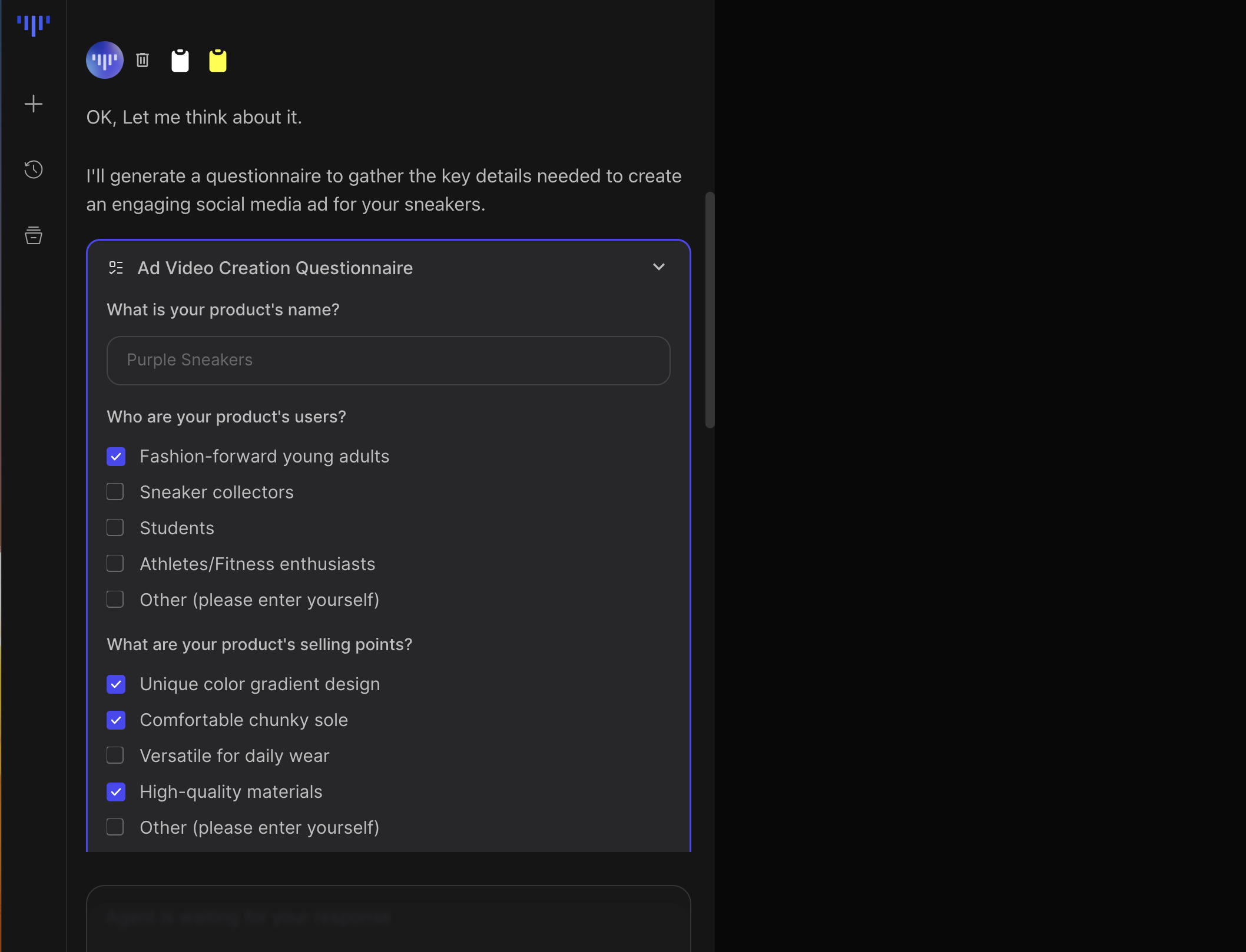 The Video Agent provides marketers with complete automation and creative control. Tone, pacing, visuals, and style can be adjusted with simple conversational prompts. Meanwhile, the agent handles scripting, scene structure, voiceover, transitions, and captions in one unified workflow. Every output is automatically optimized for TikTok, Instagram, and Facebook.