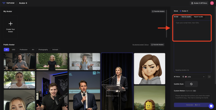 Once you're logged into your Topview account, open Avatar 4. You can either choose from the built-in avatars or upload your own image if you want something more personal.