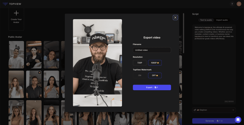 Hit "Generate"—TopView renders your video in minutes. Preview it, make quick edits if needed, then download it in HD (MP4) ready to share on social media, embed in emails, or use in presentations.