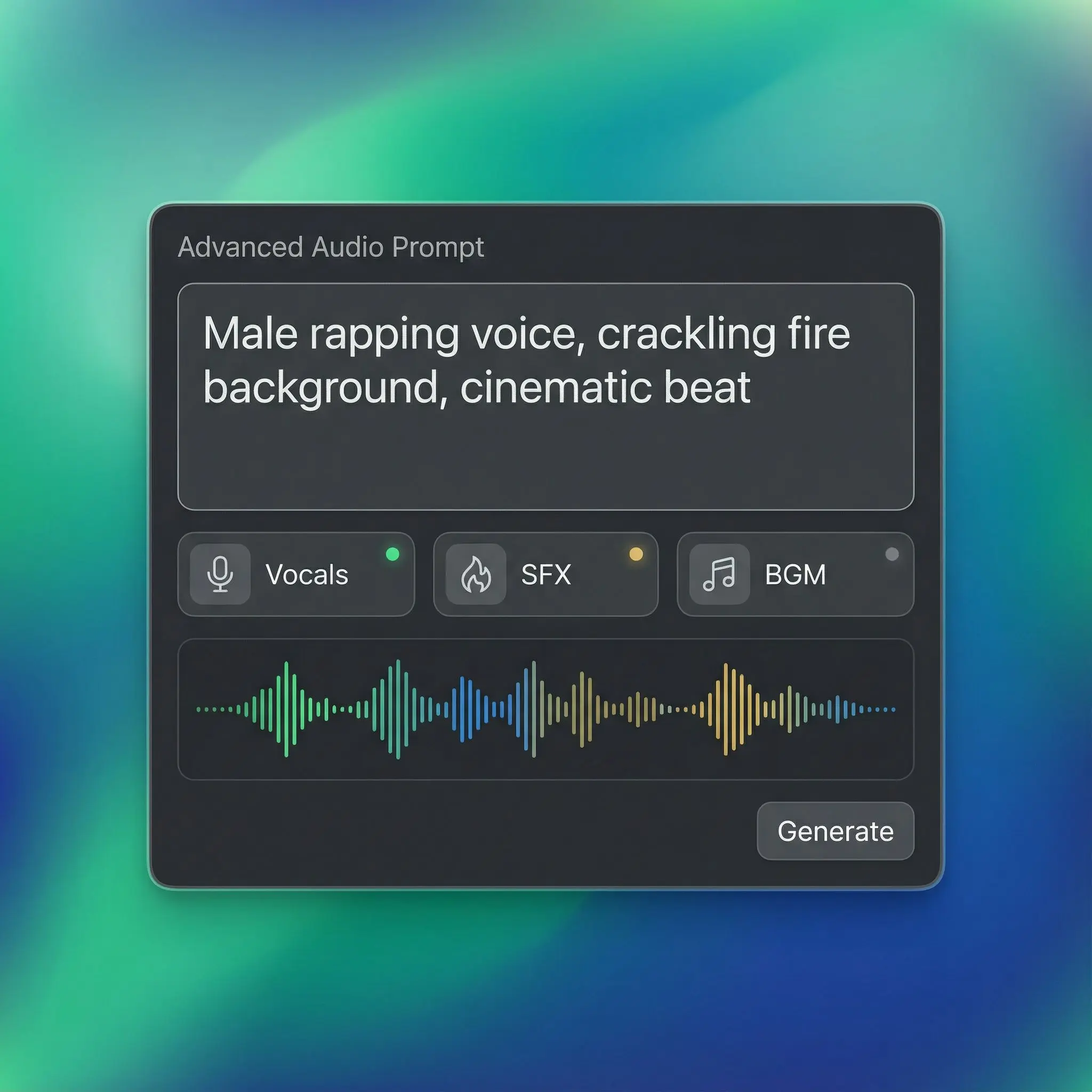 Generate human voices for speaking, singing, and rapping, plus environmental sounds like glass shattering, fire crackling, and ocean waves. Kling 2.6 delivers rich, layered audio for engaging content.